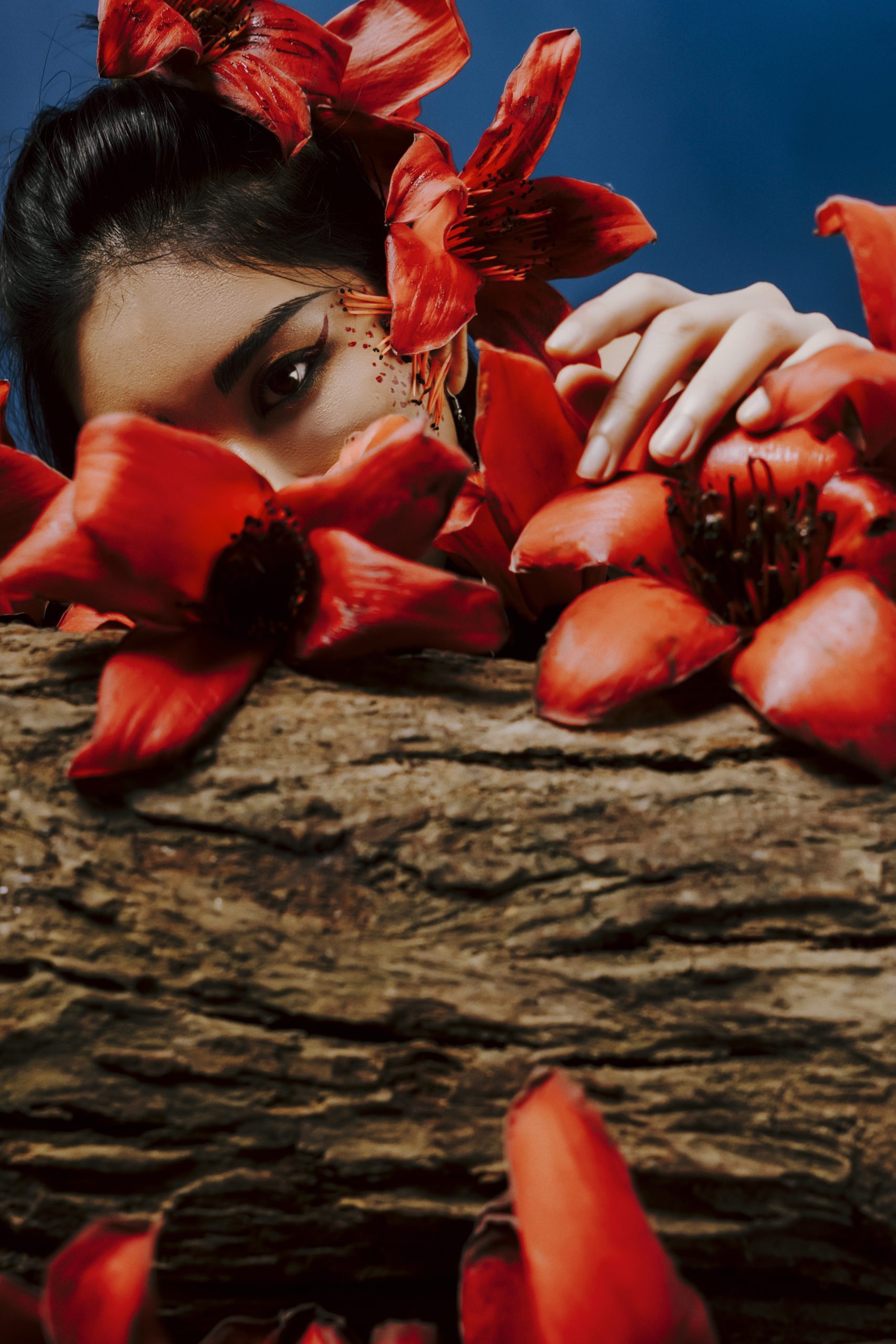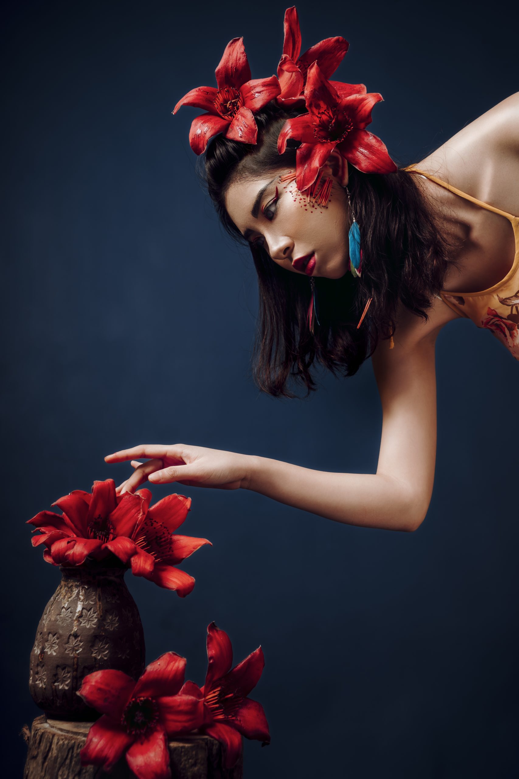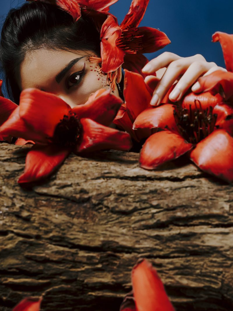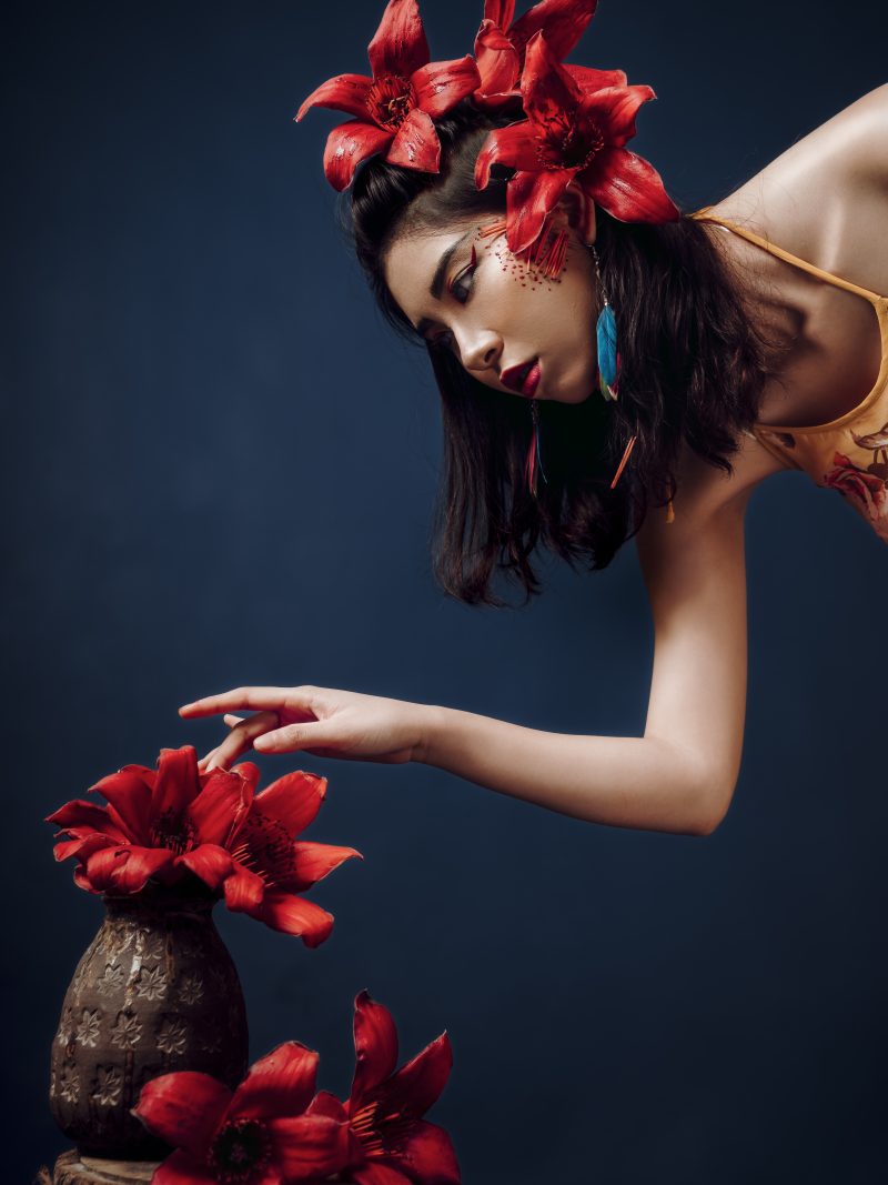 Trong studio tối lạnh, ánh sáng tập trung vào một người phụ nữ trẻ, nhưng cô ấy dường như đã mang theo cả mùa xuân rực rỡ từ bên ngoài vào. Cô ấy là cô gái hoa gạo, một nhân vật kỳ lạ và đầy mê hoặc, hóa thân từ chính những bông hoa gạo đỏ rực, nồng nàn.